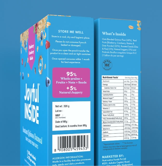 Joyful Inside is a probiotic food brand creating a new market in India. The project involved competitive research, brand strategy, brand identity and packaging design for their first line of products – India’s first probiotic oatmeal. The ask was to create a breakfast cereal brand like no other – youthful without being childish, trustworthy without any asterisks, something that no one had seen before. And that’s exactly what we did.