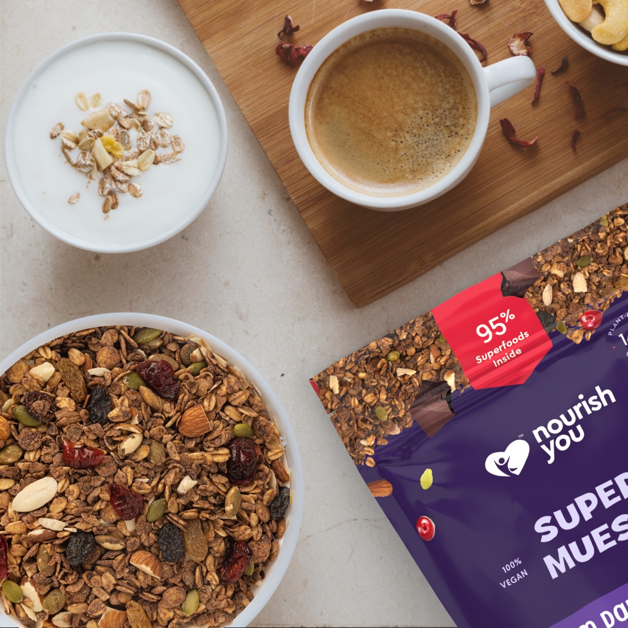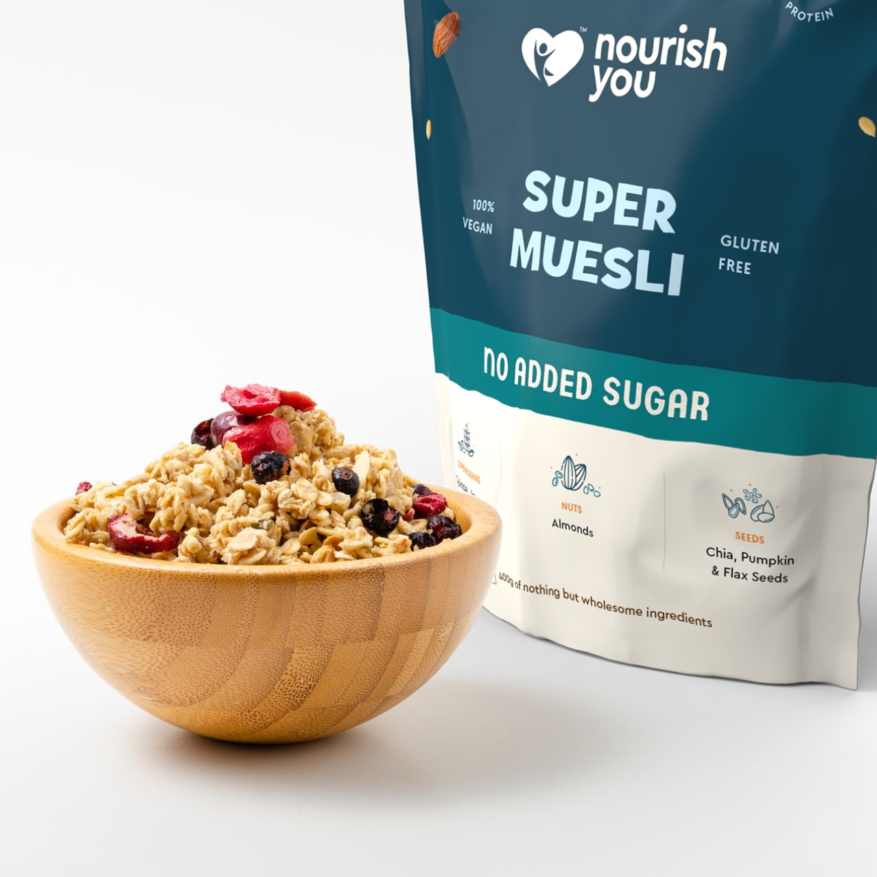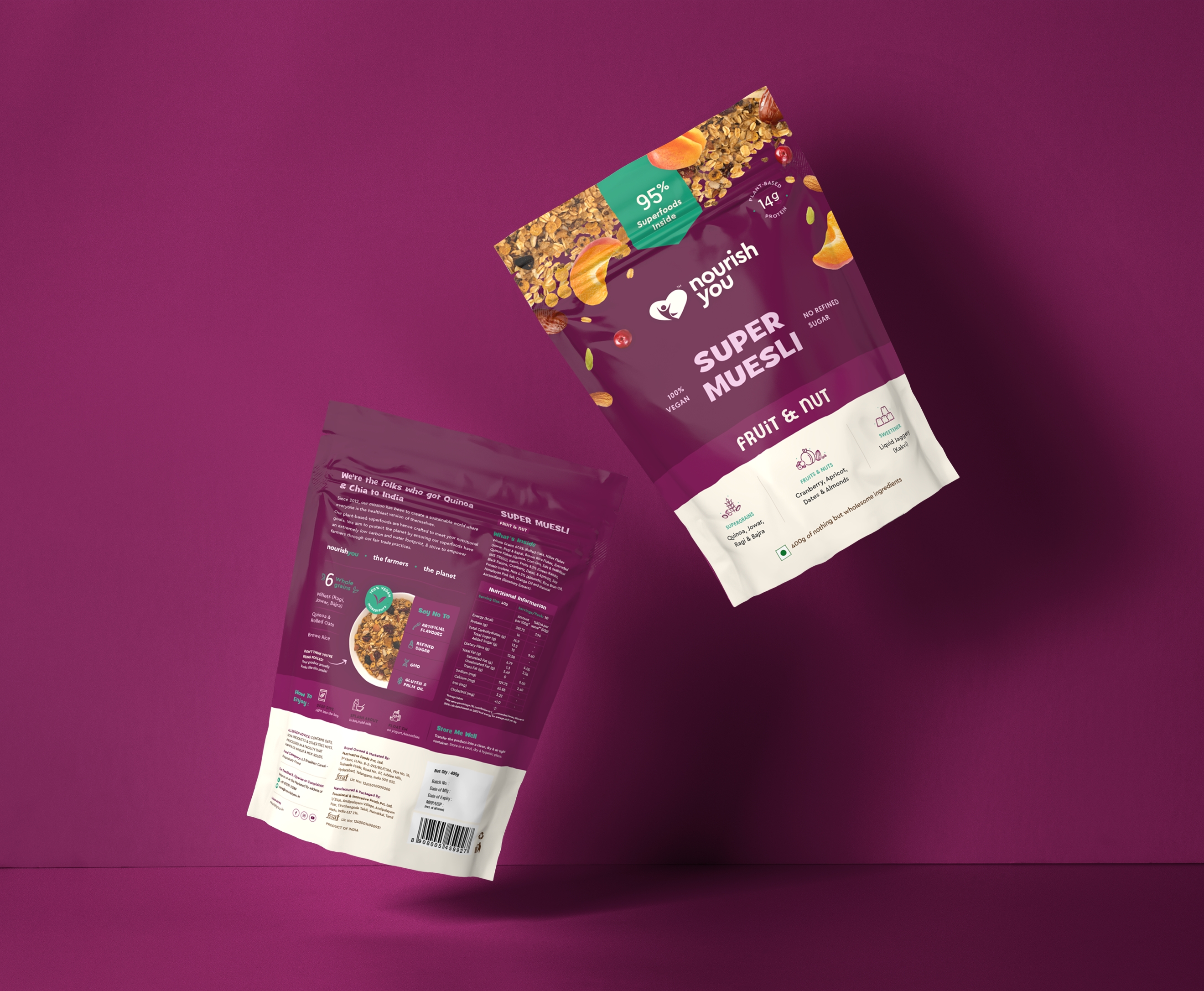 This product line was conceived around the celebration of the main ingredients and the flavour. Like Joyful Inside (a probiotic sub-brand of Nourish You’s that Lucid also designed), the idea was to visually represent the feeling of pouring ingredients out of the pack and be transparent about exactly what goes into the muesli – nothing but natural ingredients.