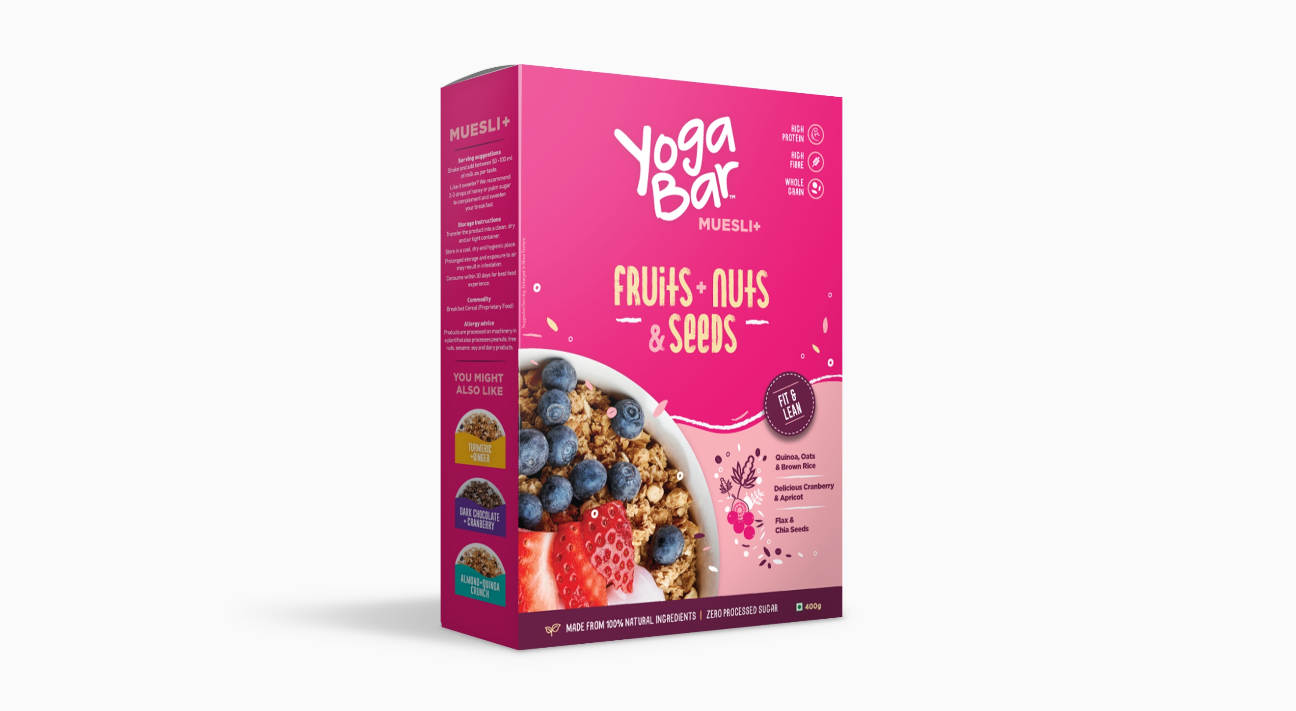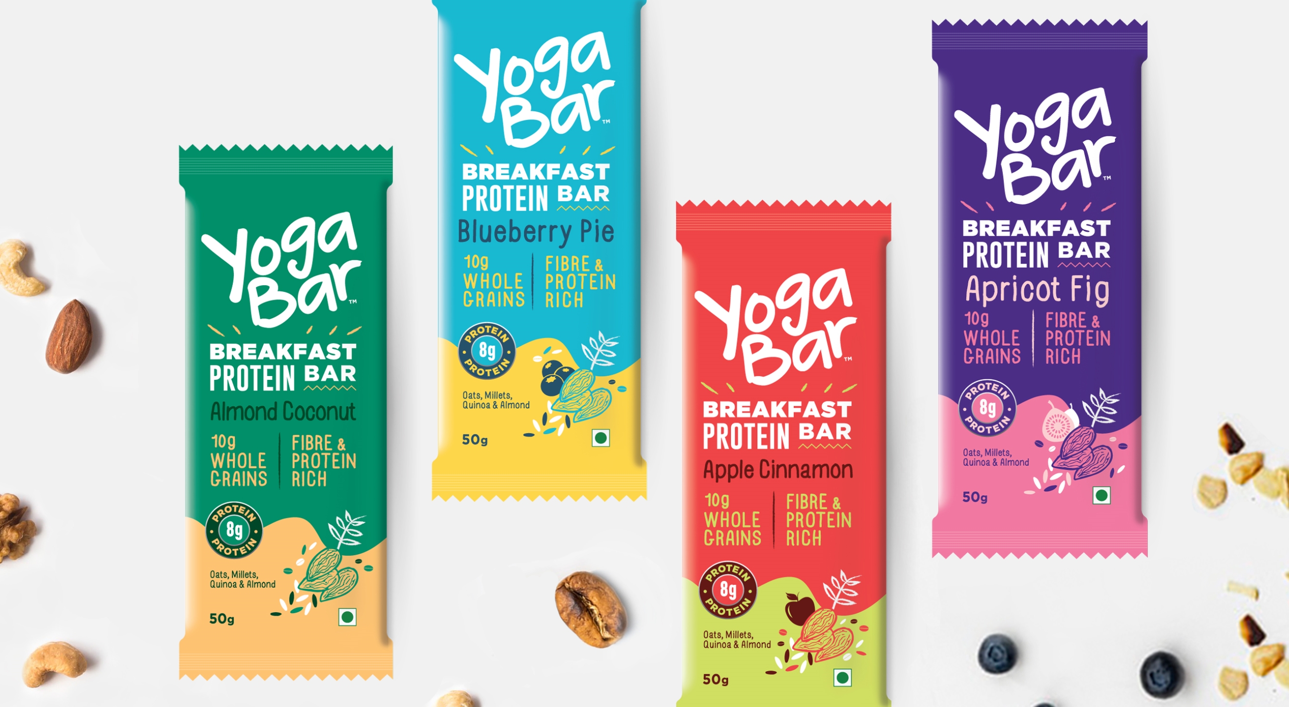 Subsequently, we’ve helped Yogabar with the design for a 20g Protein bar line for the active user, a breakfast protein bar line that supplements or replaces a meal, and a line of Muesli products in a variety of flavours. As well as several gift boxes and special edition packs.
